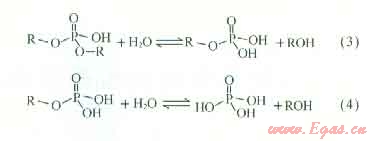 有機(jī)酯的水解反應(yīng)為?;忌系挠H核取代,羧酸酯水解反應(yīng)方程式為式(1)[11],產(chǎn)物為羧酸和飽和醇;磷酸酯水解反應(yīng)方程式為式(2)~(4),產(chǎn)物為磷酸和飽和醇??梢姡袡C(jī)酯水解后產(chǎn)物為有機(jī)酸和醇類物質(zhì)。由于有機(jī)酸為酸化常用體系,有助于酸化,同時醇類物質(zhì)具有較好的潤濕延展性,能降低表面張力。因此,有機(jī)酯不僅不會對儲層造成傷害,其水解產(chǎn)物有機(jī)酸還能起到一定的酸化效果,醇類還能解除水鎖現(xiàn)象。
