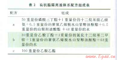 根據(jù)有機(jī)酯隔離液體系的組成,設(shè)計(jì)了3種具體的配方(表2),開展了配伍性和隔離效果評價(jià)。
