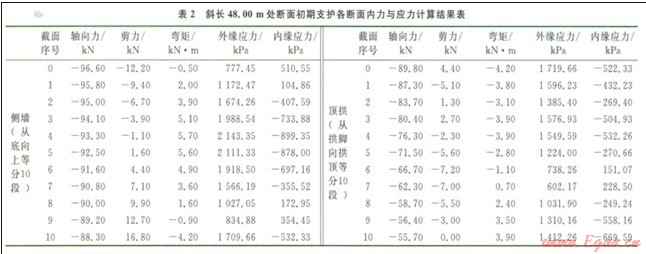斜長48.00 m處斷面初期支護(hù)各斷面內(nèi)力與應(yīng)力計(jì)算結(jié)果如表2所示。