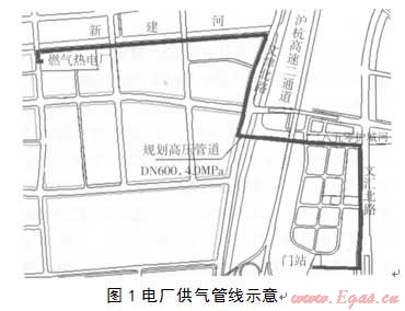 由于城市門站直線距離電廠不足3kin,管線距離僅4.5km,為此電廠所需天然氣從市門站接出,并用專線直供電廠??紤]到電廠二期擴建及減少啟停和事故狀態(tài)下對天然氣管網的沖擊,管徑選擇為DN600。但是目前的城市門站只能滿足電廠一期工程的需要,為此一期供氣工程利用現狀高壓系統,在現狀進站總管設置三通后,經計量(成撬設置)后直供電廠。同
