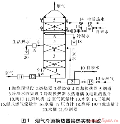 本實(shí)驗(yàn)臺(tái)是在普通燃?xì)鉄崴魃霞友b冷凝換熱器而成。實(shí)驗(yàn)系統(tǒng)由3部分組成:氣(包括天然氣、空氣、煙氣)系統(tǒng)、水系統(tǒng)和控制系統(tǒng)。實(shí)驗(yàn)系統(tǒng)見圖1。