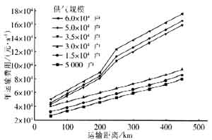 ?、谀赀\輸費用隨運輸距離線性變化,當供氣規(guī)模在3×1O4戶以下時,斜率較??;當供氣規(guī)模在3.5×104戶以上時,斜率較大,且在200 km和250km之間有一轉(zhuǎn)折。斜率差異主要是因為目前LNG汽車槽車型號少(國內(nèi)常用的LNG槽車容積主要為30 m3、40m3和45 m3),3×104戶以下供氣規(guī)模的氣化站每天所需的用氣量,單輛槽車每天運輸一次即能滿足。供氣規(guī)模超過3×104戶后,單輛槽車每天運輸2次或2輛槽車每天各運輸一次才能滿足氣化站每天所需的用氣量。出現(xiàn)轉(zhuǎn)折主要是因為建模過程中考慮到運輸安全性,規(guī)定槽車的行駛速度為70 km/h且單輛槽車每天在路上行駛的時間不超過13 h,因此當運輸距離超過200km后,氣化站每天所需的用氣量由原先的單輛槽車每天運輸2次來滿足變?yōu)?輛槽車每天各運一次來滿足,從而年運輸費用中的槽車年折舊費用、保險費用等增加。