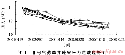 圖2顯示,Ⅱ號氣藏壓降呈指數(shù)遞減規(guī)律,線性關系較好,由線性回歸公式Y=0.004X+15.37,計算得到該氣藏的動態(tài)地質儲量為38.4×108m3。