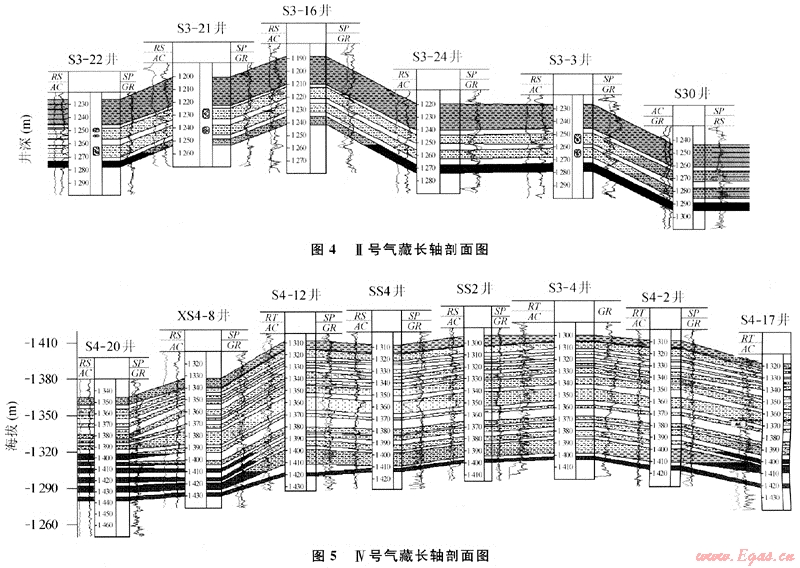 由于Ⅱ號和Ⅳ號氣藏都是多層疏松砂巖,繪制氣藏長軸剖面圖如圖4、5所示。