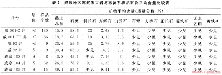 但比較四川盆地寒武系和志留系頁(yè)巖,筆者認(rèn)為,四川盆地頁(yè)巖氣勘探開發(fā)的首選目標(biāo)應(yīng)為川南志留系,理由如下:①盡管寒武系和志留系烴源巖都有較高的有機(jī)碳豐度和較好的有機(jī)質(zhì)類型,但志留系烴源巖的成熟度略低于寒武系。②運(yùn)聚條件不同,志留系烴源巖在川南地區(qū)生烴強(qiáng)度大于川東地區(qū),但在川東地區(qū),石炭系直接覆蓋在志留系之上,由于石炭系有較好的滲儲(chǔ)條件,所以形成大中型氣田[5],而川南地區(qū)雖處生烴凹陷,但由于石炭系缺失,所以二疊系直接覆蓋在志留系之上,而二疊系孔隙不發(fā)育,滲儲(chǔ)空間主要為裂縫。已有的研究表明,二疊系甚至三疊系嘉陵江組都有天然氣來自志留系,但沒有形成向石炭系那樣的大氣田。顯然川南地區(qū)志留系排烴程度沒有川東地區(qū)高,換句話說,滯留在川南志留系中的天然氣應(yīng)當(dāng)較多。據(jù)不完全統(tǒng)計(jì),川南地區(qū)鉆遇志留系有氣顯示的井有8口,也說明這一現(xiàn)象。寒武系生烴條件最好的地區(qū)是川西南地區(qū),而它受樂山龍女寺古隆起的影響較大,具備向震旦系輸氣的條件,也就是說它自身滯留天然氣的條件不如川南志留系。③礦物成分不同。從表2可見,威遠(yuǎn)地區(qū)寒武系頁(yè)巖的石英含量與志留系差不多,但黏土含量低于志留系的頁(yè)巖,而黏土與吸附氣的多少有關(guān),石英則與造縫能力相關(guān)。