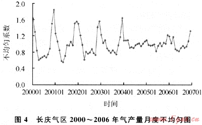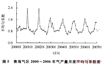 近幾年由于受國家經(jīng)濟(jì)宏觀調(diào)控政策和城市環(huán)保要求提高等因素的影響,民用、發(fā)電等用氣增長較快,但民用和采暖用氣的季節(jié)性不均勻問題突出,冬季高月和夏季低月值相差很大。中國石油每年的1、2、3、10、11、12等6個(gè)月的不均勻系數(shù)偏大(不均勻系數(shù)為月產(chǎn)量與年均月產(chǎn)量的比值),最高為12月份,連續(xù)6a的12月不均勻系數(shù)都在1.2以上,2005年不均勻系數(shù)達(dá)到了1.54的高峰,峰谷差為1.3~1.5倍(圖3)[4~5]。