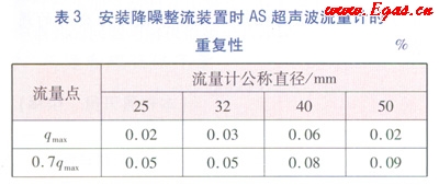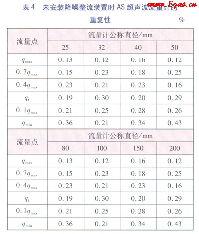 據(jù)國(guó)家質(zhì)量監(jiān)督檢驗(yàn)檢疫總局發(fā)布的超聲波標(biāo)準(zhǔn)JJG 10302007《超聲流量計(jì)》的要求,的重復(fù)性不能超過(guò)相應(yīng)準(zhǔn)確度等級(jí)規(guī)定的最相對(duì)誤差絕對(duì)值的15,即作為1.5級(jí)的AS流量計(jì)的重復(fù)性,除分界流量點(diǎn)(qt)以下的應(yīng)滿(mǎn)足重復(fù)性≤0.6%外,其他流量點(diǎn)應(yīng)滿(mǎn)足≤0.3%。流量計(jì)的重復(fù)性越小,性能越好。析表3和表4中的數(shù)據(jù),安裝降噪整流裝置的As超聲波流量計(jì)的重復(fù)性比不安裝降噪整流裝置的超聲波流量計(jì)的重復(fù)性要小很多,達(dá)到0.5級(jí)AS超聲波流量計(jì)的重復(fù)性的要求。試驗(yàn)證明降噪整流裝置的整流效果在超聲波流量計(jì)的重復(fù)性方面也能體現(xiàn)。