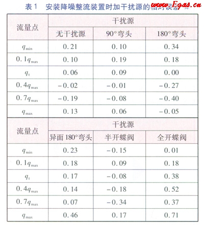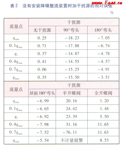 為了使試驗(yàn)結(jié)果更有對(duì)比性和說(shuō)服力,對(duì)沒(méi)有安裝降噪整流裝置的AS超聲波流量計(jì)進(jìn)行了相同的試驗(yàn)。試驗(yàn)完畢后對(duì)數(shù)據(jù)進(jìn)行了統(tǒng)計(jì),具體數(shù)據(jù)見(jiàn)表2。通過(guò)數(shù)據(jù)分析,沒(méi)有安裝降噪整流裝置的AS超聲波流量汁在以上5種干擾源的環(huán)境下測(cè)量出來(lái)的相對(duì)誤差偏離非常大,最大達(dá)到了-76.11%左右。因半開(kāi)的蝶閥能使氣流的方向傾斜向管壁,對(duì)AS超聲波流量計(jì)的計(jì)量結(jié)果影響最為突出。在檢定qmax流量點(diǎn)時(shí)因受斜向氣流的干擾,AS超聲波流量計(jì)出現(xiàn)了不計(jì)量報(bào)警的異常狀態(tài)。在超聲波流量計(jì)的電子系統(tǒng)中,能有效剔除由混響、電磁干擾等引起的計(jì)量誤差的算法不能消除機(jī)械情況下的干擾引。由此說(shuō)明降噪整流裝置在整流方面起著決定性的作用。