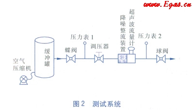 試驗(yàn)中,用來(lái)產(chǎn)生超聲波噪聲的設(shè)備是調(diào)壓器。在氣體流動(dòng)的過(guò)程中,調(diào)壓器兩側(cè)的壓力差越大所產(chǎn)生的超聲波噪聲越大。本測(cè)試的方法是:在一個(gè)容積為5m3的緩沖罐中充入空氣,使其內(nèi)部達(dá)到500kPa左右的絕對(duì)壓力,緩沖罐的一側(cè)接有DN 50mm的管道,管道上依次接有蝶閥、壓力表1、調(diào)壓器、降噪整流裝置、AS超聲波流量計(jì)、壓力表2和球閥。為了模擬實(shí)際使用現(xiàn)場(chǎng),特約束了它們之間的距離。蝶閥與壓力表1相距10D(D為管道公稱(chēng)直徑),壓力表1與調(diào)壓器相距15D,調(diào)壓器與降噪整流裝置相距5D,降噪整流裝置與AS超聲波流量計(jì)直接連接,超聲波流量計(jì)與壓力表2相距10D,壓力表2與球閥相距10D,測(cè)試系統(tǒng)見(jiàn)圖2。選用的AS超聲波流量計(jì)規(guī)格為DN 50mm,始動(dòng)流量為0.37m3h,流量范圍為3150m3h。