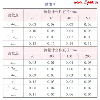 試驗(yàn)的方法為:在標(biāo)準(zhǔn)表校驗(yàn)裝置上被檢表的位置安裝好待測(cè)的儀器后,按照校驗(yàn)流量計(jì)的方法分別對(duì)qmin、0.1qmax、qt、0.4qmax、0.7qmaxqmax的流量點(diǎn)進(jìn)行校驗(yàn)。qmin為流量計(jì)的標(biāo)稱(chēng)最小流量qmax為流量計(jì)的標(biāo)稱(chēng)最大流量;qt為分界流量,即流量范圍被分割成“高區(qū)”和“低區(qū)”的分界點(diǎn)的流量,“高區(qū)”的準(zhǔn)確度等級(jí)為流量計(jì)的標(biāo)稱(chēng)準(zhǔn)確度等級(jí),“低區(qū)”的準(zhǔn)確度等級(jí)為流量計(jì)的標(biāo)稱(chēng)準(zhǔn)確度等級(jí)的2倍。