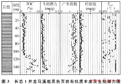 對上揚子地區(qū)下志留統龍馬溪組有機碳含量統計,發(fā)現下志留統龍馬溪組有機碳含量變化大,分布在0.1%~8.65%之間,多數大于1%。長寧-珙縣地區(qū)鉆探的長芯1井,通過對龍馬溪組下部黑色頁巖153m連續(xù)取心的有機碳含量分析(圖3)同樣反映出這種變化特征。在110m以淺,TOC含量處在1%~3%之間,平均為2%,110~153m井段(龍馬溪組最底部)TOC均大于2%,平均值可達到6%。全井段統計,TOC>2.0%的累計厚度可達80m,主要分布于龍馬溪組下段(包括上奧陶統約10m的五峰組碳質頁巖),這將是形成頁巖氣藏最有利層段。