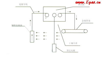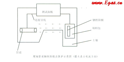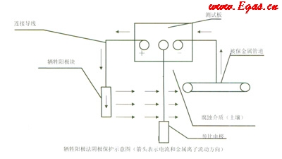 針對埋地管道電解化學(xué)腐蝕的過程和實(shí)際情況,我們應(yīng)從兩方面解決管道的防腐問題。一是加強(qiáng)管道的絕緣性:①管道第一層涂環(huán)氧粉末;②第二層涂聚乙烯(PE);③第三層涂EVA樹脂。增火回路電阻,減少腐蝕電流。二是用犧牲陽極保護(hù)法,對管道進(jìn)行陰極保護(hù)。見示意圖: