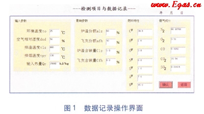 運用Matlab軟件對上述鍋爐熱效率計算數(shù)學模型進行編程,通過VB軟件進行可視化界面顯示,Matlab軟件與VB軟件通過Active X實現(xiàn)連接,可實現(xiàn)在線的數(shù)據(jù)傳遞和后臺的計算反饋。數(shù)據(jù)記錄操作界面見圖1(受實際情況限制,圖1中使用的名詞和量符號與文內(nèi)使用的名詞和量符號沒有完全對應)。