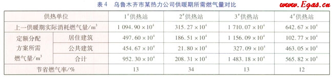 按照定額分配方案,將供暖熱負荷指標代入上述公式,計算出不同室外溫度下單位時間所需燃氣量,進而推算出在烏魯木齊的氣象條件下,各供熱單位在一個供暖期(183d)內(nèi)所需燃氣量,并與實際消耗燃氣量進行比較,比較結(jié)果見表4。