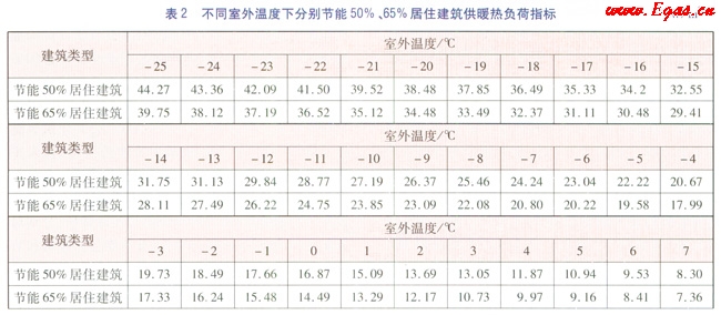 根據(jù)文獻[1]及GB 50736—2012《民用建筑供暖通風與空氣調(diào)節(jié)設計規(guī)范》、JCJ 26—2010《嚴寒和寒冷地區(qū)民用建筑節(jié)能設計標準》、JGJ 26—5《民用建筑節(jié)能設計標準(供暖居住建筑部分)》規(guī)定的汁算參數(shù),以烏魯木齊市供熱區(qū)域內(nèi)某居住建筑為例,進行能耗分析。該建筑坐北朝南,共6層,建筑高度為16.8m,總建筑面積為4112.64m2,體形系數(shù)為0.28。節(jié)能50%居住建筑外墻傳熱系數(shù)為0.43W/(m2·K),外窗的傳熱系數(shù)為2.47W/(m2·K);節(jié)能65%居住建筑外墻傳熱系數(shù)為0.35W/(m2·K),外窗傳熱系數(shù)為1.8W/(m2·K)。計算得出不同室外溫度(室外溫度取整數(shù))時,該居住建筑分別節(jié)能65%、50%時的供暖熱負荷指標,計算結(jié)果見表2。當室外溫度達到16℃時,鍋爐停止供暖,熱負荷指標為0,但由于烏魯木齊的晝夜溫差可逾20℃,因此存在白天停止供暖,傍晚及夜間又恢復供暖的情況。