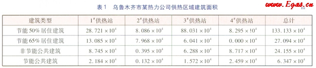 通過走訪、調(diào)研統(tǒng)計出該熱力公司(下轄4座供熱站)供熱區(qū)域內(nèi)的各類建筑的面積(見表1)。由表1可知,烏魯木齊市某熱力公司總供熱面積為190.729×104m2,其中節(jié)能50%居住建筑面積為133.133×104m2,節(jié)能65%居住建筑面積為27.094×104m2,非節(jié)能公共建筑面積為24.155×104m2,節(jié)能公共建筑面積為6.347×104m2。