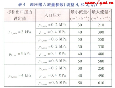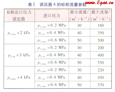 以一款直接作用式調(diào)壓器A為例,該調(diào)壓器的進(jìn)口壓力范圍為dp1=0.2~0.6MPa(即p1,min=0.2MPa,p1,max=0.6MPa),出口壓力范圍dp2=2~4kPa(即p2,min=2kPa,p2,max=4kPa)。其標(biāo)稱穩(wěn)壓精度等級(jí)Ac=10,標(biāo)稱關(guān)閉壓力等級(jí)Sg=20,標(biāo)稱關(guān)閉壓力區(qū)等級(jí)Sz=20,標(biāo)稱靜特性曲線族的關(guān)閉壓力區(qū)等級(jí)Sz,p=20。相應(yīng)的標(biāo)稱流量參數(shù)見表2。