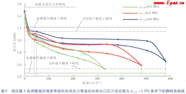 以標(biāo)稱出口壓力設(shè)定值p2,int=3kPa為例(調(diào)整參數(shù)后的靜特性曲線圖見圖5),調(diào)整流量參數(shù)后,調(diào)壓器A在標(biāo)稱出口壓力p2,int=3kPa條件下的實(shí)際穩(wěn)壓精度為Ac,a=4.97<5(圖5中的實(shí)際穩(wěn)壓精度等級(jí)線與標(biāo)稱穩(wěn)壓精度等級(jí)線幾乎重合,為了使圖線得以區(qū)分,圖5在繪制過程中進(jìn)行了適當(dāng)放大處理,將實(shí)際穩(wěn)壓精度等級(jí)線與標(biāo)稱穩(wěn)壓精度等級(jí)線的間距適當(dāng)加大);實(shí)際關(guān)閉壓力等級(jí)為Sg,a=17.31<20;三條靜特性曲線的實(shí)際關(guān)閉壓力區(qū)等級(jí)分別為:p1=0.2MPa時(shí)Sz,a=19.23<20,p1=0.4MPa時(shí)Sz,a=6.67<20,p1=0.6MPa時(shí)Sz,a=5.52<20;實(shí)際靜特性曲線族的關(guān)閉壓力區(qū)等級(jí)為Sz,p,a=19.78<20。