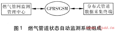 燃氣管道狀態(tài)自動監(jiān)測系統(tǒng)包括監(jiān)測管理中心、GPRS/GSM(GPRS為通用分組無線業(yè)務,GSM為全球移動通信系統(tǒng))、分布式管道數(shù)據采集終端,系統(tǒng)組成見圖1。