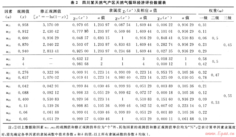 以四川某天然氣產(chǎn)區(qū)為例,通過到天然氣生產(chǎn)企業(yè)和相關(guān)政府部門調(diào)研討論,并依據(jù)各單因素指標(biāo)數(shù)據(jù)以及各指標(biāo)權(quán)重,計(jì)算各方面數(shù)據(jù),整理如表2。