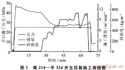 由于炮眼磨損引起的施工壓力變化在限流法壓裂施工曲線中有很明顯的顯示,圖1是南214-平324井的主壓裂施工曲線,從圖中可以看出支撐劑到達(dá)井底后,井口壓力大幅度下降,這在其他壓裂方式中是沒有的現(xiàn)象。此現(xiàn)象是由于支撐劑加入引起的混砂液凈液柱壓力、管柱摩阻和孔眼摩阻的變化綜合作用的結(jié)果。根據(jù)南214-平324井的井身結(jié)構(gòu)及施工情況定量計(jì)算出前兩項(xiàng)的值[6~7],可以發(fā)現(xiàn)它們對(duì)施工壓力的影響遠(yuǎn)沒有這么大,因此可以判斷出現(xiàn)施工壓力如此大幅度降低的主要原因是孔眼受支撐劑打磨孔徑變大后,摩阻急劇降低造成的,但目前的壓裂設(shè)計(jì)軟件還不能模擬孔眼摩阻的動(dòng)態(tài)變化對(duì)裂縫形態(tài)的影響。