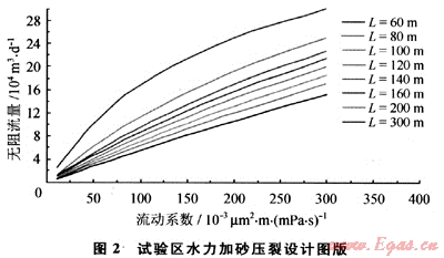 采用節(jié)點(diǎn)模型開展地層流動(dòng)物性與裂縫長度之間相關(guān)性分析、預(yù)測(cè)不同裂縫與地層匹配情況下的無阻流量、根據(jù)前期試驗(yàn)成果及微型注入測(cè)試分析,建立了試驗(yàn)區(qū)壓裂設(shè)計(jì)圖版(圖2),該圖版與現(xiàn)場(chǎng)試驗(yàn)結(jié)果具有很好的一致性。