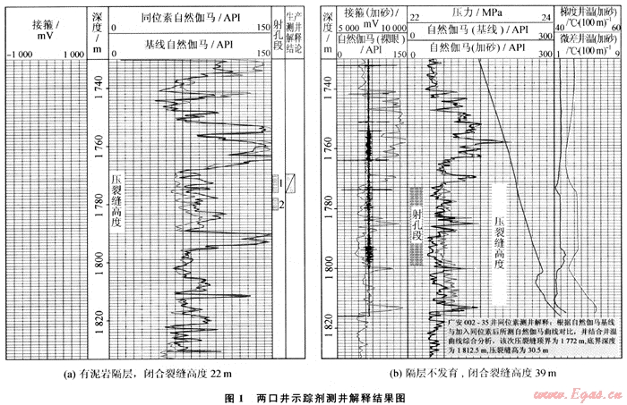在壓裂施工中加入示蹤劑,通過壓后井溫度測(cè)井和示蹤劑確定縫口裂縫高度。通過對(duì)裂縫高度測(cè)量,可以對(duì)泥巖隔層的遮擋性和儲(chǔ)層裂縫高度延伸規(guī)律進(jìn)行研究,進(jìn)一步優(yōu)化壓裂設(shè)計(jì),與壓裂數(shù)據(jù)共同分析,確定裂縫有效幾何形態(tài)(圖1)。