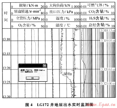 鉆至井深3320.63m時濕度開始快速升高,至井深3321.00m上升至78%(圖4);觀察出口返出的巖屑較少,顏色深,具濕潤感,部分呈團塊狀,經(jīng)綜合分析,判斷地層出水,及時進行了預(yù)警。