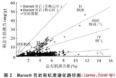 需要注意:初始有機質(zhì)豐度較高的烴源巖,隨著熱演化程度加深,生烴量增加,殘余有機碳豐度、氫指數(shù)、有機質(zhì)類型呈現(xiàn)降低、變差趨勢,如Tmax(最大熱解溫度)432℃、等效成熟度0.62%,Barnett頁巖演化至Tmax為470℃,等效成熟度為1.3%時,TOC數(shù)值可降低36%(圖2),對于高成熟和/或過成熟烴源巖,負面影響則更大,所以簡單套用殘余有機碳豐度、氫指數(shù)或于酪根類型判斷頁巖生氣能力的高低可能有失偏頗。但儲集能力而言,殘余有機質(zhì)豐度??杀碚骱瑲饬看笮?,特別是當(dāng)兩者呈現(xiàn)正相關(guān)情況下。北美頁巖氣勘探目標絕大多數(shù)選擇TOC含量大于2%,甚至4%以上,與此有關(guān)聯(lián)。因此資源潛力評價過程中應(yīng)綜合考量有機質(zhì)豐度指標,既要重視源巖原始有機質(zhì)豐度與生烴潛力,又要關(guān)注頁巖儲層殘余總有機碳含量的作用。