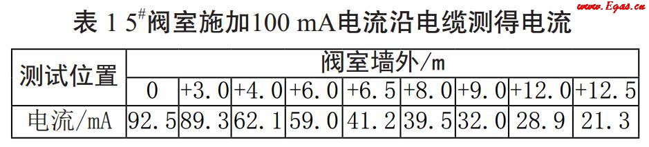 將RD8000的發(fā)射機(jī)正極連接陽極電纜,負(fù)極接地,調(diào)節(jié)適當(dāng)頻率。打開電源,輸出正常。打開接收機(jī)電源,調(diào)節(jié)頻率與接收機(jī)一致,查找電纜位置走向,同時(shí)測量電流大小。當(dāng)電纜上方前后電流大小有明顯變化時(shí),初步判斷該處電纜斷點(diǎn)或虛接(表 1)。