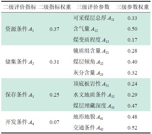 利用層次分析法對(duì)鎮(zhèn)威煤田各礦區(qū)中的煤層氣選區(qū)的關(guān)鍵要素進(jìn)行定量排序, 將研究區(qū)煤層氣資源、儲(chǔ)集條件、保存條件和煤層氣開(kāi)發(fā)基礎(chǔ)條件作為4 個(gè)二級(jí)評(píng)價(jià)指標(biāo),每個(gè)二級(jí)評(píng)價(jià)指標(biāo)對(duì)于煤層氣開(kāi)發(fā)的影響又受多個(gè)三級(jí)參數(shù)的影響,包括可采煤層總厚、含氣量、資源豐度、揮發(fā)分含量、鏡質(zhì)組含量、煤層穩(wěn)定性、灰分含量、頂?shù)装鍘r性、水文地質(zhì)條件、煤層埋藏深度、地形地貌及交通條件(表3)。