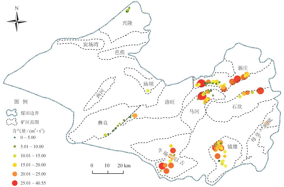 鎮(zhèn)威煤田煤層含氣量橫向上總體表現(xiàn)為東高西低的特征,彝良和廟壩礦區(qū)含氣量較低,一般不超過(guò)15 m3/t ;新莊礦區(qū)西部、馬河礦區(qū)、牛場(chǎng)—以古礦區(qū)和鎮(zhèn)雄礦區(qū)西北部煤層含氣量較高,一般介于9 ~ 18m3/t ;東部石坎礦區(qū)、母享—則底礦區(qū)及新莊礦區(qū)東部含氣量變化較大,一般介于5 ~ 20 m3/t,最大含氣量可達(dá)40 m3/t(圖3)。