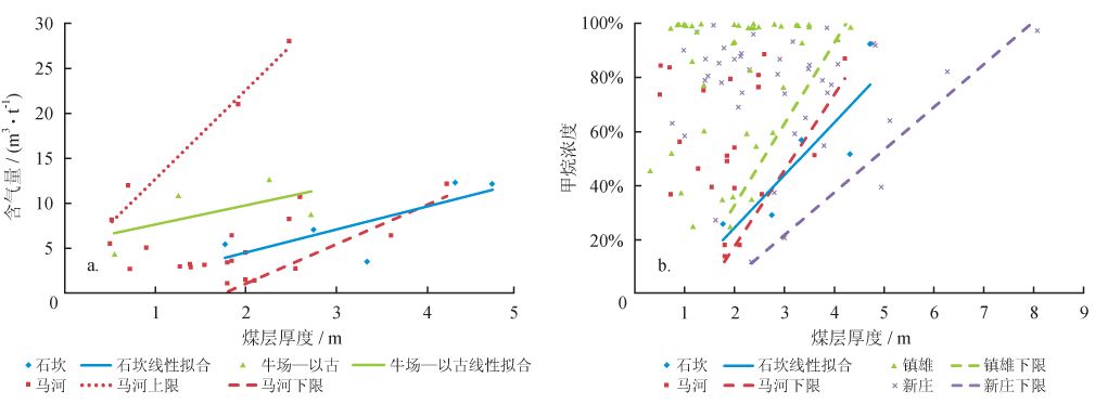 含氣量與煤厚大體上呈正相關(guān)關(guān)系,部分礦區(qū)含氣量與煤厚呈較明顯的線性正相關(guān)關(guān)系,如石坎礦區(qū)(相關(guān)系數(shù)為0.6)。較常見(jiàn)的情況是含氣量與煤層厚度之間存在一定的離散性,但其中煤層厚度與含氣量上限及含氣量下限同時(shí)存在較明顯的線性關(guān)系,如馬河礦區(qū)(圖5-a)。甲烷濃度的下限與煤厚普遍表現(xiàn)為正相關(guān)關(guān)系,反映煤層厚度的增加有助于煤層氣的保存(圖5-b)??傊?,煤層厚度不僅控制了煤儲(chǔ)層的生氣潛力,對(duì)煤層氣保存也有一定影響,在煤層頂?shù)装灞4鏃l件不理想的情況下,煤層厚度對(duì)含氣量的影響更為顯著。