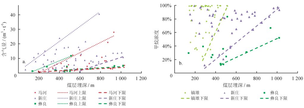 含氣量上限與煤層埋深關(guān)系呈正相關(guān)關(guān)系,含氣量下限則受煤層埋深影響較小,如馬河礦區(qū)和新莊礦區(qū)等(圖7-a),各礦區(qū)最大含氣量對(duì)應(yīng)的埋藏深度自西向東增加,可能由于西部較高的地?zé)崽荻仁古R界深度變淺[16]。甲烷濃度下限與煤層埋深呈正相關(guān)關(guān)系,甲烷濃度下限受埋深影響的顯著程度可能受到煤層厚度、煤變質(zhì)程度和頂?shù)装灞4鏃l件的綜合約束(圖7-b)。