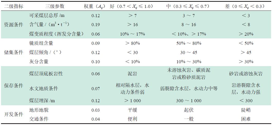 2)從資源條件、儲(chǔ)集條件、保存條件和開(kāi)發(fā)條件4 個(gè)方面優(yōu)選出可采煤層總厚、平均含氣量、煤變質(zhì)程度、鏡質(zhì)組含量、煤層傾角、灰分含量、頂?shù)装鍘r性、水文條件、煤層埋深、地形地貌、交通條件等11 個(gè)煤層氣勘探開(kāi)發(fā)影響因素作為評(píng)價(jià)參數(shù),建立基于多層次模糊數(shù)學(xué)方法的煤層氣選區(qū)評(píng)價(jià)模型。