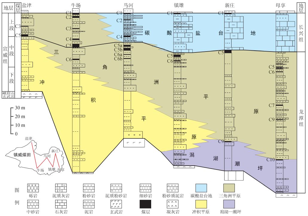 2 鎮(zhèn)威煤田上二疊統(tǒng)沉積相及煤層分布示意圖