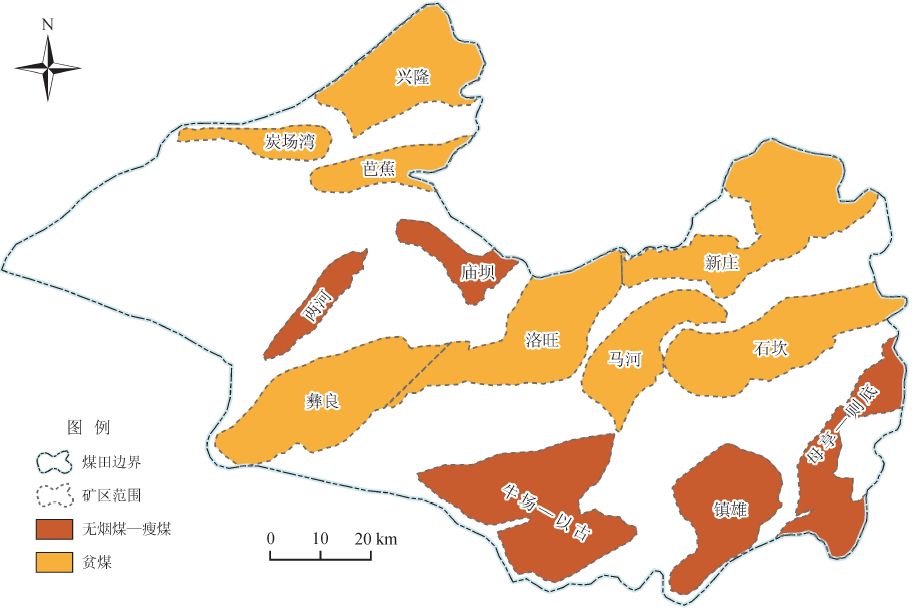 鎮(zhèn)威煤田煤變質(zhì)程度相對(duì)較高,煤類以瘦煤、貧煤和無(wú)煙煤為主,揮發(fā)分含量介于2% ~ 28%,鏡質(zhì)組最大反射率介于1.95% ~ 2.74%。受構(gòu)造作用影響[13],最大變質(zhì)程度分別達(dá)到貧煤與無(wú)煙煤的礦區(qū)表現(xiàn)為近東西向條帶在南北方向相間分布,無(wú)煙煤主要分布于母享—則底、鎮(zhèn)雄、牛場(chǎng)—以古以及兩河、廟壩礦區(qū),貧煤主要分布在石坎、新莊、馬河、彝良、洛旺以及興隆、炭場(chǎng)灣、芭蕉礦區(qū)(圖8)。