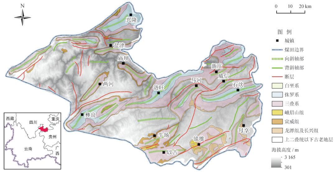 鎮(zhèn)威煤田地理位置位于云南省東北部,北接川南煤田,東臨黔西北煤田,東西長(zhǎng)約125 km,南北寬約120 km,面積約為10 800 km2(圖1)。大地構(gòu)造位置位于古揚(yáng)子板塊西南緣,中二疊世末期上揚(yáng)子地區(qū)在東吳運(yùn)動(dòng)中結(jié)束茅口期陸表海環(huán)境,再次整體抬升為陸地,中二疊統(tǒng)茅口組石灰?guī)r遭受風(fēng)化作用形成廣泛分布的殘積平原[11]。中、晚二疊世之交峨眉山玄武巖大規(guī)模噴溢[12],向東波及至小江斷裂帶,其厚度整體由西向東逐漸變薄,形成了滇東—黔西地區(qū)上二疊統(tǒng)含煤巖系的沉積基底。后期燕山運(yùn)動(dòng)和喜馬拉雅運(yùn)動(dòng)使得現(xiàn)今煤田構(gòu)造以北東—北東東向隔擋式褶皺為主要特征,向斜較寬緩,背斜較緊密,各向斜構(gòu)造幾乎均具北西翼陡而南東翼緩的特點(diǎn)。斷裂構(gòu)造相對(duì)發(fā)育較差,以北東向?yàn)橹鳎蔽鳌⒈北蔽飨虼沃?,擠壓逆沖斷層占主導(dǎo)地位[13](圖1)。