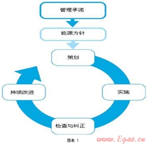 用能企業(yè)是實(shí)現(xiàn)能源節(jié)約的核心。在以節(jié)能減排為重要目標(biāo)的指引下,企業(yè)使用任何能源,都應(yīng)制定一個(gè)基本的控制程序,形成一個(gè)有效能源管理體系運(yùn)行模式。企業(yè)為兌現(xiàn)管理承諾和實(shí)現(xiàn)能源方針應(yīng)進(jìn)行策劃-實(shí)施-檢查與糾正-持續(xù)改進(jìn)(PDCA)等過(guò)程。圖示如下(圖表1):