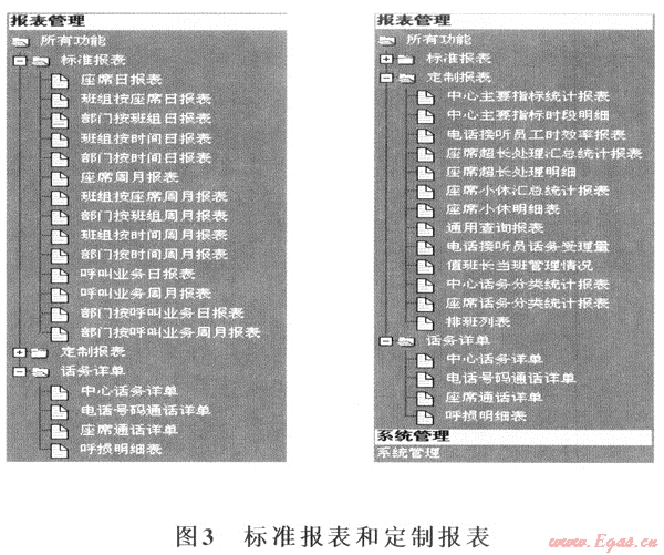 與服務(wù)熱線數(shù)字化管理的基本應(yīng)用工具比較,報(bào)表反映的內(nèi)容更全面更系統(tǒng)。尤其體現(xiàn)在熱線定制報(bào)表上。它把企業(yè)多年來在傳統(tǒng)數(shù)據(jù)統(tǒng)計(jì)匯總報(bào)表上積累的經(jīng)驗(yàn)作了優(yōu)化組合和集中提煉,針對性和效果都很好。圖3截取了報(bào)表管理系統(tǒng)中有關(guān)報(bào)表分類的樹狀結(jié)構(gòu)分布。