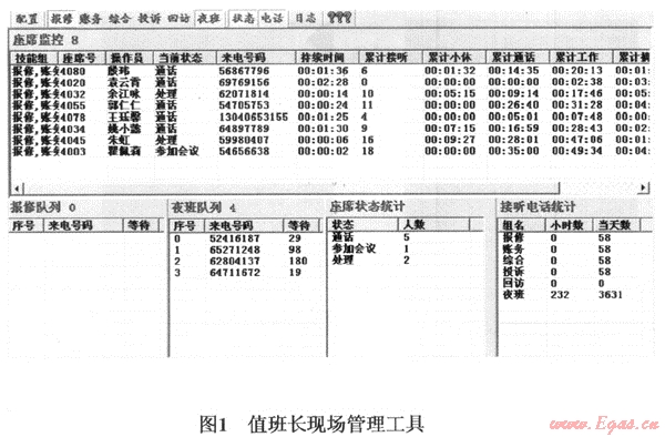 請注意,此處“當(dāng)前狀態(tài)”顯示的信息正是本文前述“工作狀態(tài)量化考核”中提及的基本內(nèi)容。如果“狀態(tài)”時(shí)間超標(biāo),對應(yīng)的“持續(xù)時(shí)間”一列數(shù)據(jù)顯示就會(huì)變成紅色,提示值班長應(yīng)予重點(diǎn)關(guān)注,必要時(shí)進(jìn)行適當(dāng)干預(yù),確保服務(wù)熱線現(xiàn)場工作有序進(jìn)行。管理工具的下半部顯示出各技能分組隊(duì)列放置情況、當(dāng)前話務(wù)統(tǒng)計(jì)數(shù)據(jù)及坐席人員配置現(xiàn)狀。一旦有情況,當(dāng)班值班長可以根據(jù)隊(duì)列狀態(tài)及時(shí)調(diào)整相關(guān)技能組的人員配置。