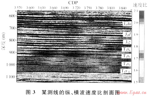 根據(jù)同一地層,縱波、橫波旅行時(shí)的差異,在層位匹配后可以得地層的平均縱、橫波速度比。由圖3可見(jiàn),砂巖地層速度比大于泥巖速度比,清晰地分辨了砂泥層。