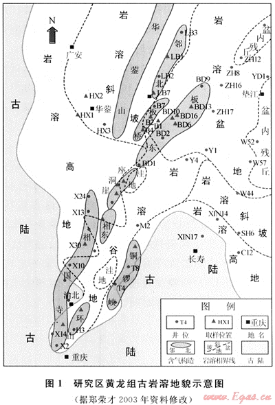 碳酸鹽礦物鍶同位素地球化學特征是碳酸鹽巖成因分析最重要的證據之一[1~2],近年來國外將鍶同位素地球化學特征廣泛地應用于碳酸鹽巖石學、巖相古地理和儲層地質學等研究領域中,而將其應用到碳酸鹽巖古巖溶儲層中的成果則很少[3~4]。筆者僅就渝北-鄰水地區(qū)上石炭統(tǒng)黃龍組古巖溶儲層的鍶同位素特征對巖溶過程的流體性質和古水文條件展開討論,為預測和評價此類儲層提供有關的地質-地球化學信息。