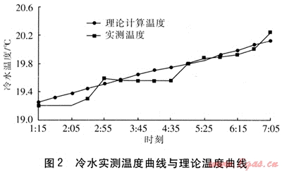 某日冷水機(jī)組關(guān)機(jī)后,不同時刻冷水實(shí)測溫度與由式(5)計(jì)算得到的理論溫度的比較見圖2。由圖2可知,實(shí)測溫度與由式(5)計(jì)算得到的理論溫度吻合較好,因此可采用式(5)計(jì)算停機(jī)后某時刻冷水溫度。