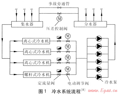 為了保證在部分負(fù)荷時冷水機(jī)組的高效運(yùn)行,選用3臺離心式冷水機(jī)與1臺螺桿式冷水機(jī),在過渡季節(jié)或負(fù)荷較小時,只開啟螺桿式冷水機(jī)。冷水機(jī)進(jìn)出水溫度為13、7℃,冷水機(jī)與附屬設(shè)備見表1[8]??照{(diào)水系統(tǒng)為一次泵、末端變流量、機(jī)組側(cè)定流量系統(tǒng),采用二管制,豎向不分區(qū),末端空調(diào)裝置采用風(fēng)機(jī)盤管,冷水系統(tǒng)流程見圖1㈨。