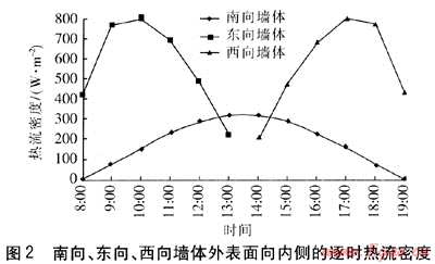 墻體內(nèi)外側(cè)表面?zhèn)鳠嵯禂?shù)分別取8.7、23.3W/(m2·K),根據(jù)文獻[7]提供的圍護結(jié)構(gòu)基本耗熱量及圍護結(jié)構(gòu)傳熱系數(shù)計算式,計算得出圍護結(jié)構(gòu)傳熱系數(shù)為0.3W/(m2·K)。若室內(nèi)溫度保持18℃,根據(jù)傳統(tǒng)墻體供暖熱負荷計算方法,得到單位面積基本耗熱量為17.7W/m2。由圖2可知,除了南向墻體8:00、19:00兩個時刻熱流密度小于17.7W/m2外,其余時刻在太陽輻射條件下3個朝向墻體外表面向內(nèi)側(cè)的熱流密度均遠高于單位面積基本耗熱量。因此,在實際設(shè)計及運行中,應(yīng)根據(jù)建筑墻體朝向及太陽輻射情況,采用合理的供暖系統(tǒng)運行方案,這樣既能滿足供熱要求,又能合理地使用能源,降低運行成本。