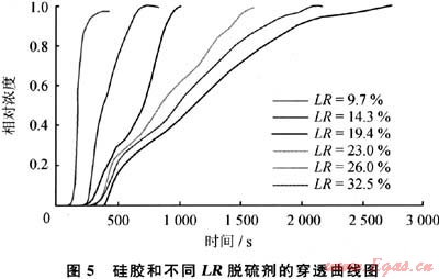 我國GB 17820一1999《天然氣》規(guī)定,城市管道天然氣中硫化氫含量標(biāo)準(zhǔn)為:一類天然氣中硫化氫含量不大于6mg/m3,二類天然氣中硫化氫含量不大于20mg/m3,三類天然氣中硫化氫含量小于460mg/m3。而GB 18047—2000《車用壓縮天然氣》規(guī)定,車用壓縮天然氣中硫化氫含量不大于15mg/m3。由圖5可以看出,LR>14.3%的脫硫劑,硫化氫穿透時間長于300s,即300s內(nèi)產(chǎn)品氣中不含硫化氫,符合一類城市管道天然氣和車用天然氣用氣要求。