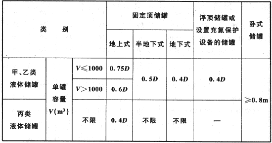 2不同液體、不同形式儲(chǔ)罐之間的防火間距不應(yīng)小于本表規(guī)定的較大值。