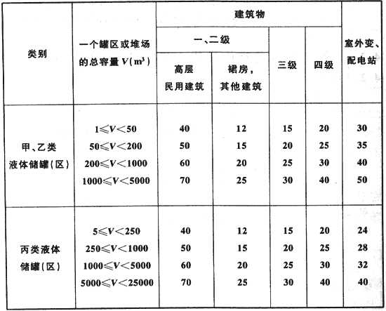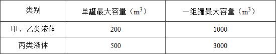 注:1當(dāng)甲、乙類(lèi)液體儲(chǔ)罐和丙類(lèi)液體儲(chǔ)罐布置在同一儲(chǔ)罐區(qū)時(shí),罐區(qū)的總?cè)萘靠砂?m3甲、乙類(lèi)液體相當(dāng)于5m3丙類(lèi)液體折算。