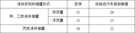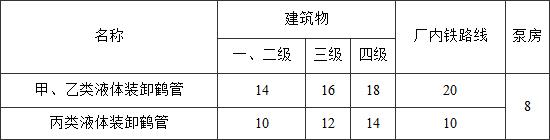 注:裝卸鶴管與其直接裝卸用的甲、乙、丙類(lèi)液體裝卸鐵路線(xiàn)的防火間距不限。